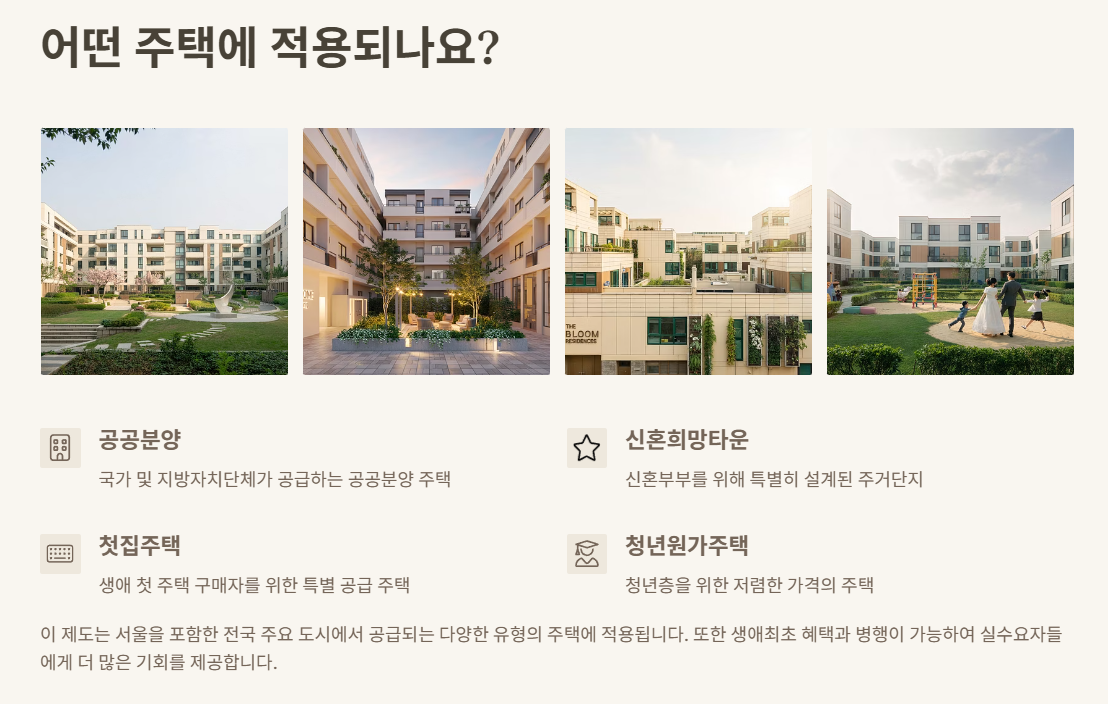 이 제도는 서울을 포함한 전국 주요 도시에서 공급되는 다양한 유형의 주택에 적용됩니다. 또한 생애최초 혜택과 병행이 가능하여 실수요자들에게 더 많은 기회를 제공합니다.