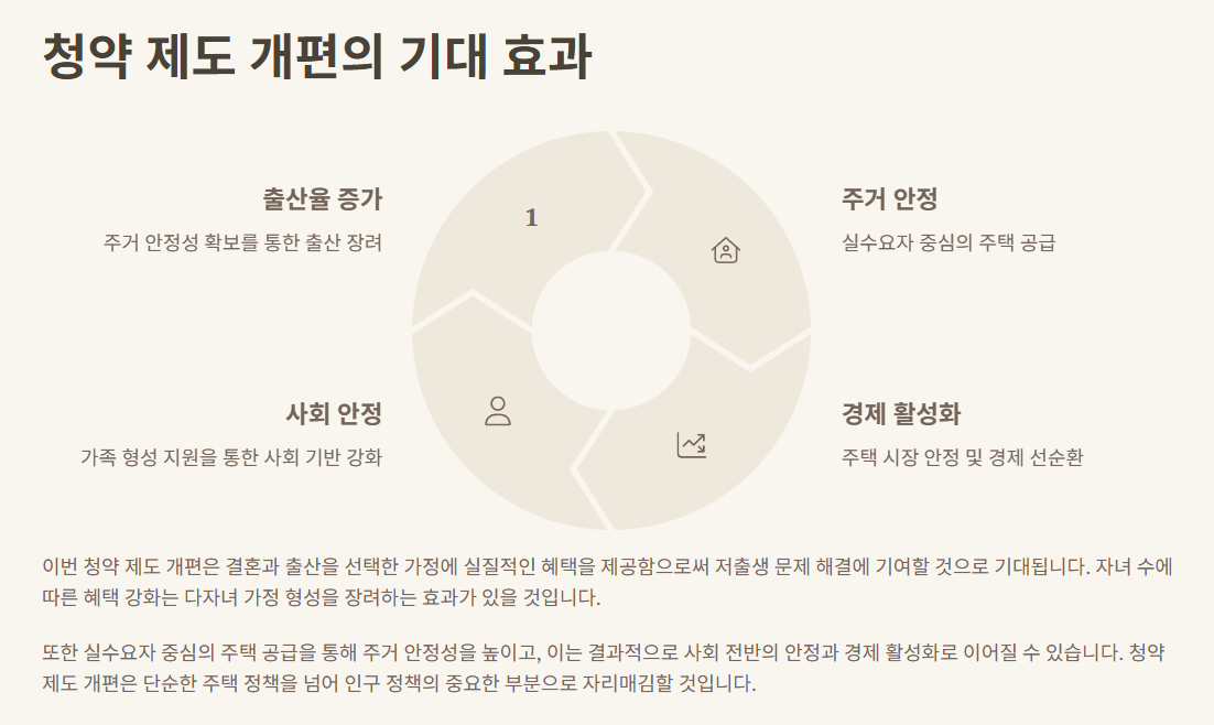 이번 청약 제도 개편은 결혼과 출산을 선택한 가정에 실질적인 혜택을 제공함으로써 저출생 문제 해결에 기여할 것으로 기대됩니다.