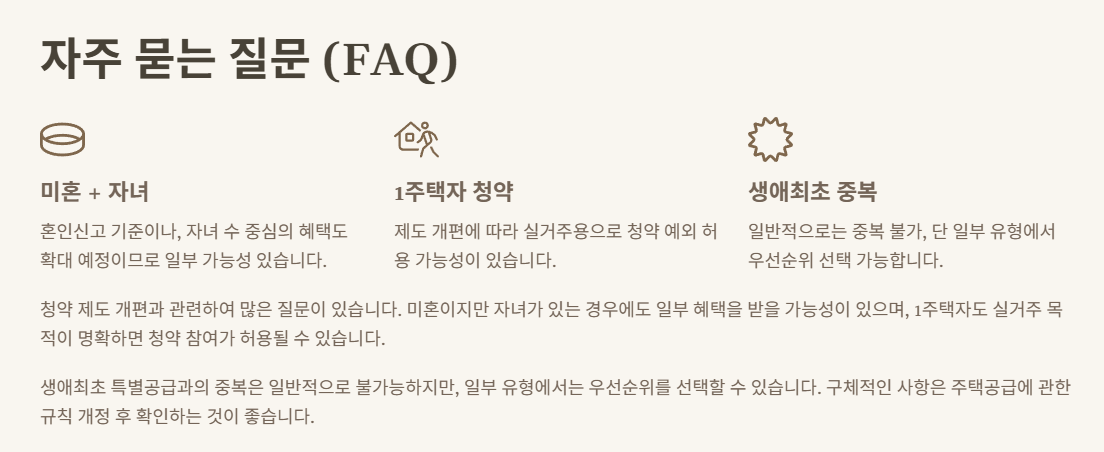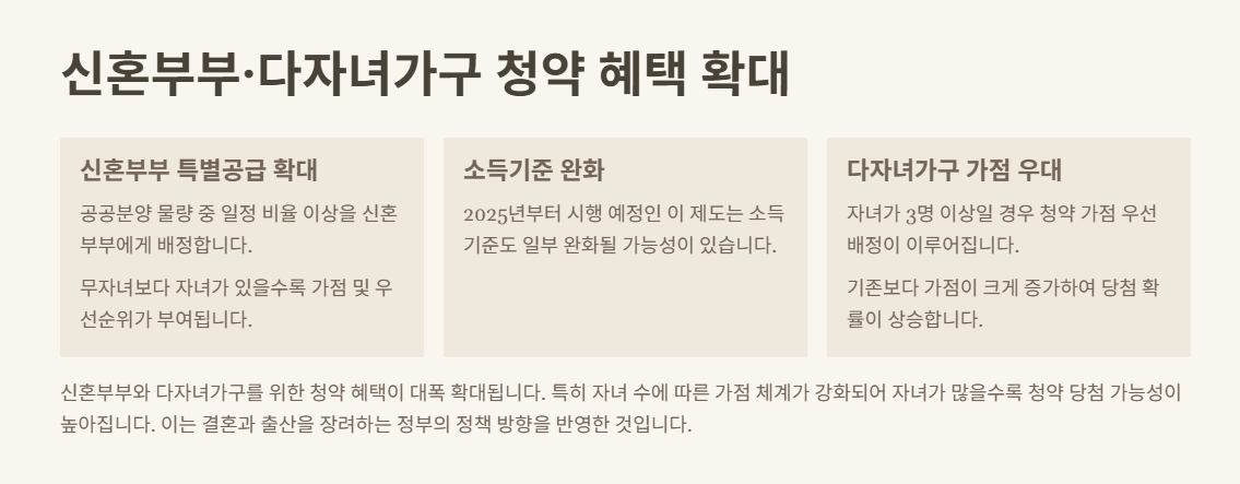 • 다자녀가구 가점 우대: 자녀가 3명 이상일 경우 청약 가점 우선 배정