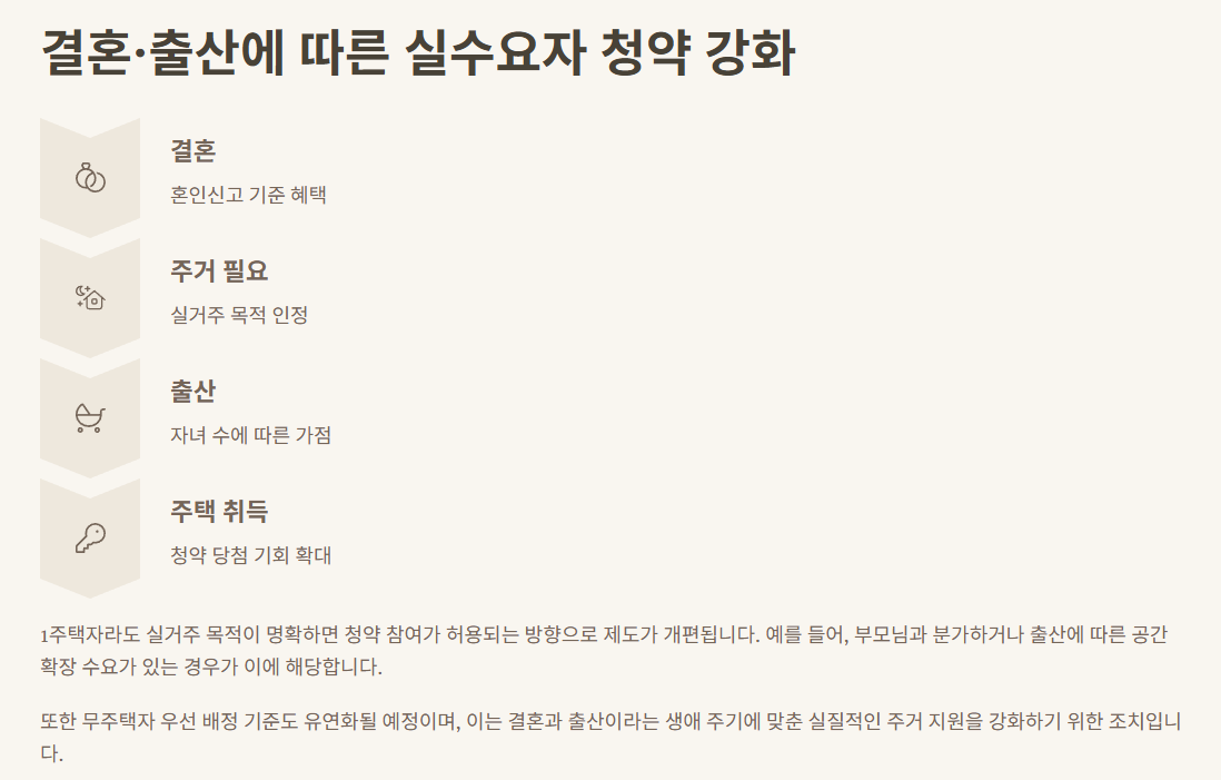 • 신혼부부 특별공급 확대: 공공분양 물량 중 일정 비율 이상을 신혼부부에게 배정