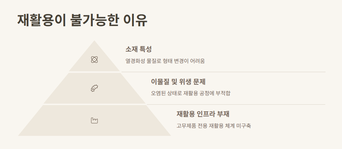 고무는 열을 가해도 녹지 않는 가교된 열경화성 물질로, 플라스틱처럼 형태를 바꿔 재활용하는 것이 기술적으로 매우 어렵습니다. - 이물질 및 위생 문제