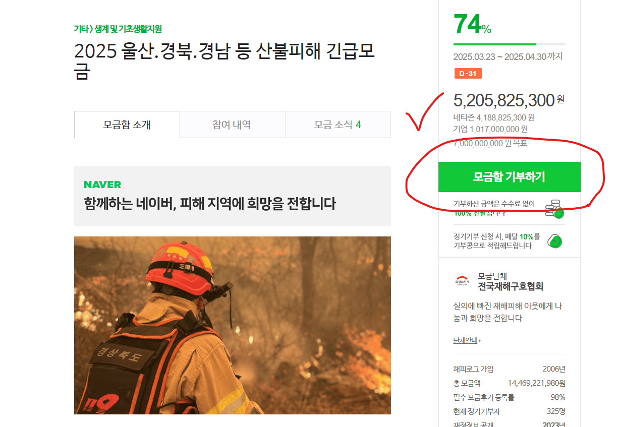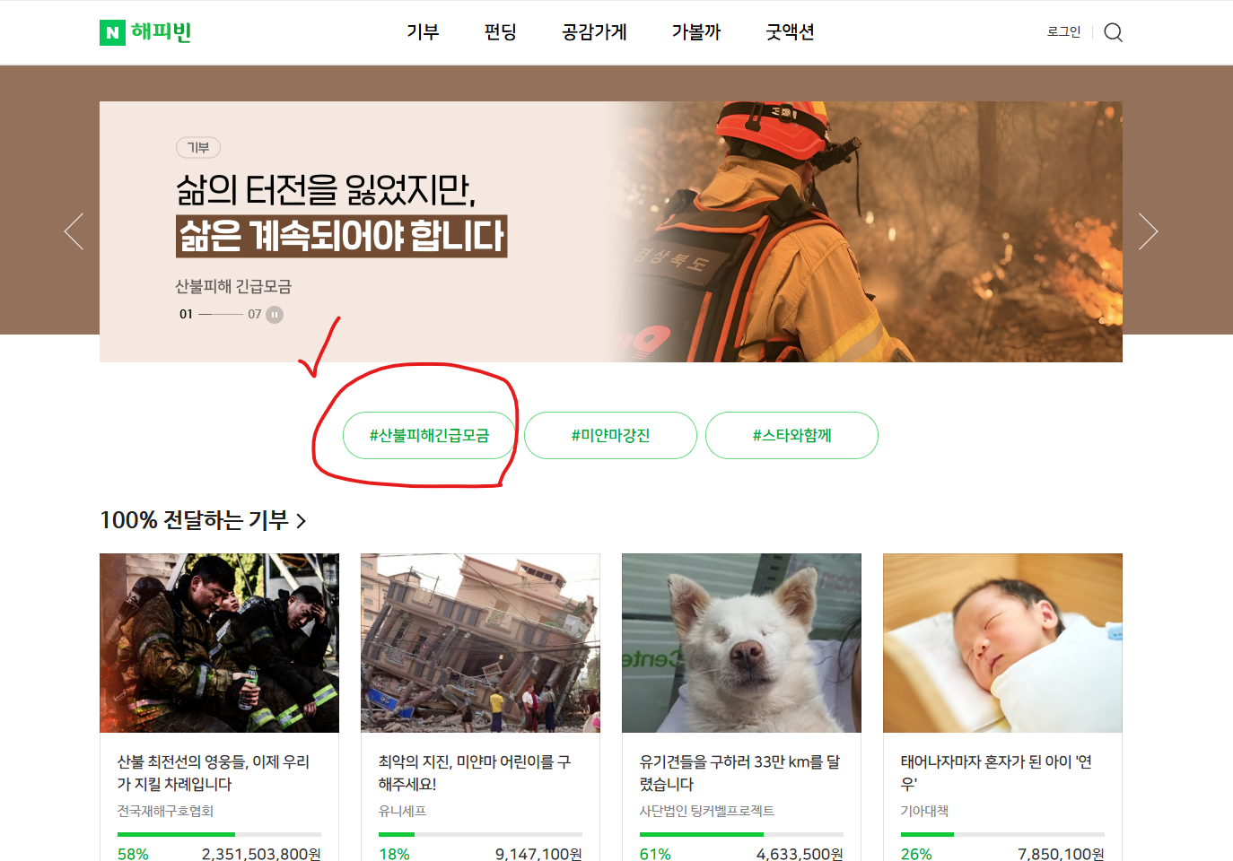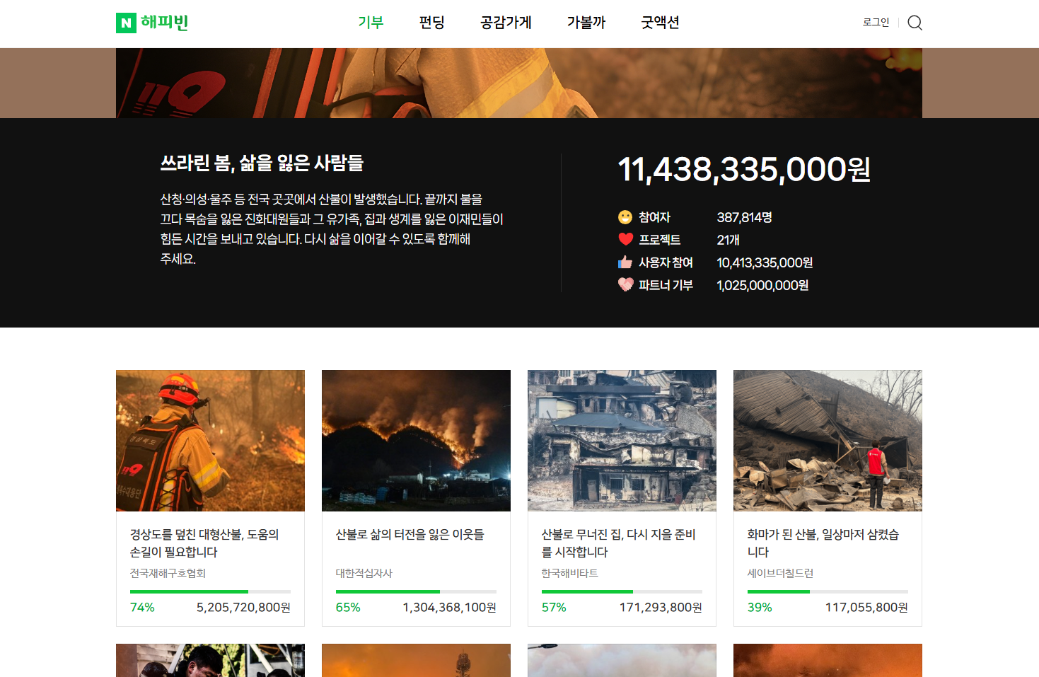 네이버에서는 해피빈을 통해 산불 피해 지원 기부가 가능합니다.