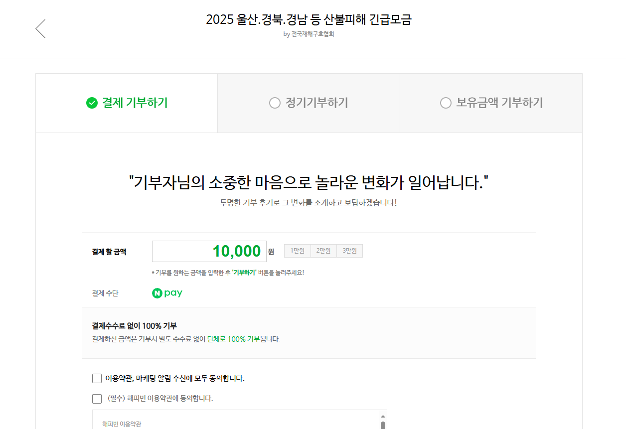 🔹 3단계: 기부금 선택 후 결제 진행 (네이버페이 사용 가능)