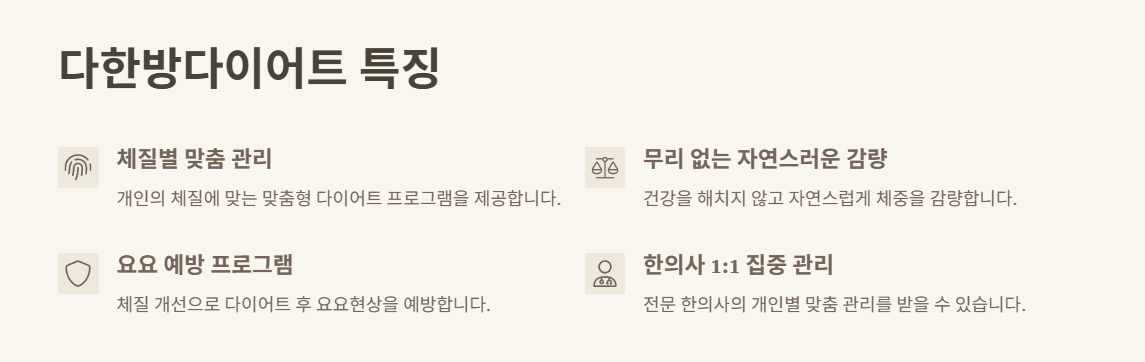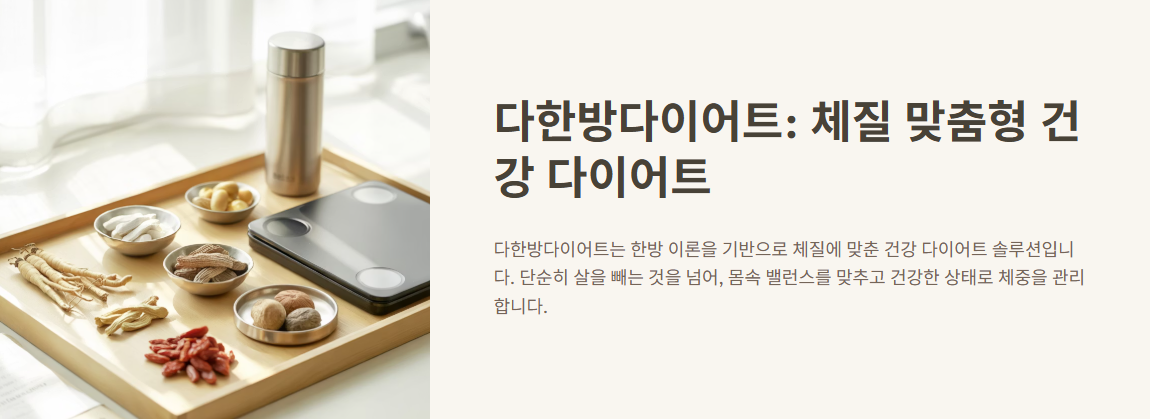 "다한방다이어트"는 한방 이론을 기반으로 체질에 맞춘 건강 다이어트 솔루션입니다. 단순히 살을 빼는 것을 넘어, 몸속 밸런스를 맞추고 건강한 상태로 체중을 관리하는 것을 목표로 해요.