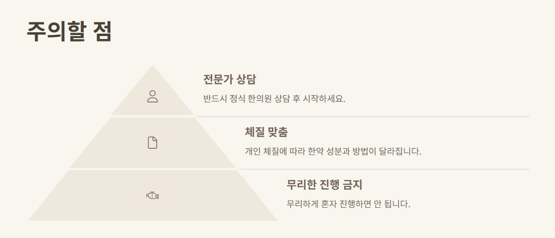 개인 체질에 따라 한약 성분과 방법이 달라지기 때문에, 무리하게 혼자 진행하면 안 됩니다.