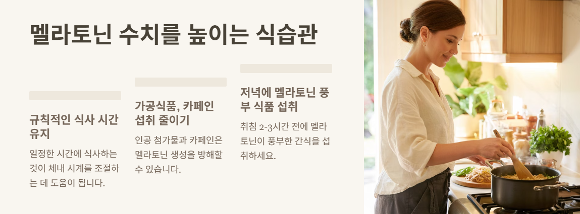 • 아침 : 멜라토닌이 적은 식품 섭취, 햇빛 노출로 체내 시계 조절.