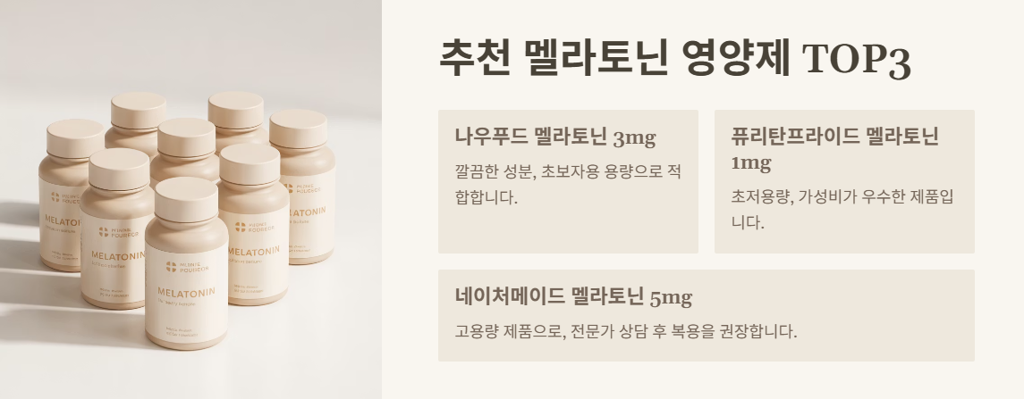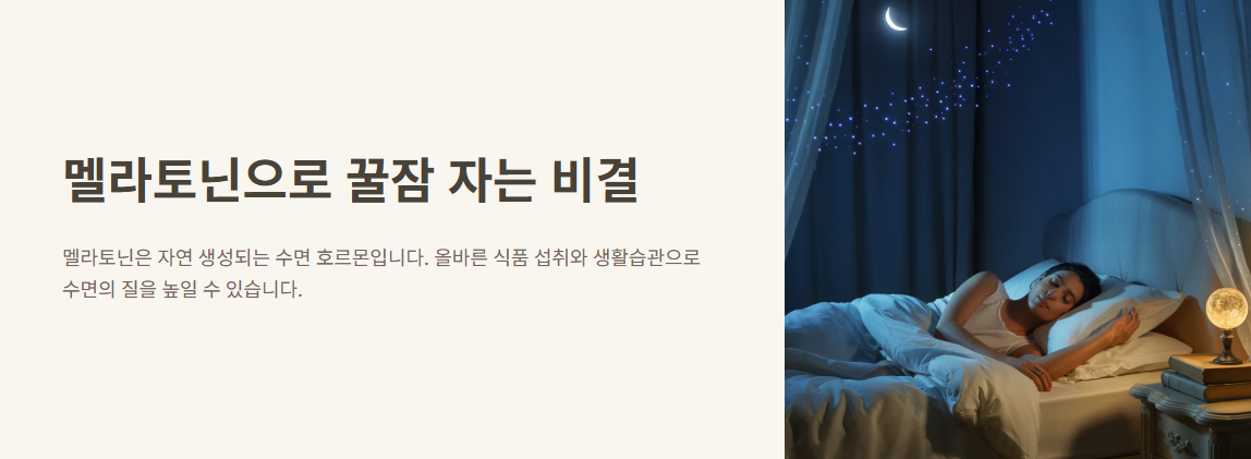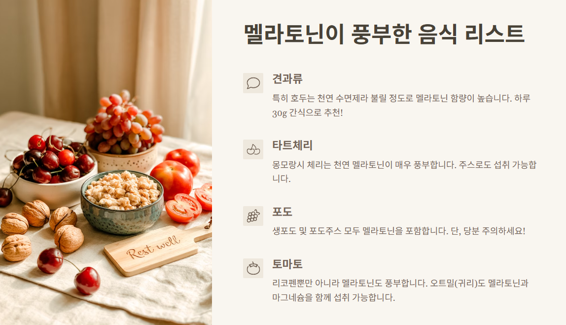 멜라토닌은 자연 생성되는 호르몬이기 때문에, 식품 섭취 + 생활습관 개선으로 충분히 수면 질 향상이 가능합니다.