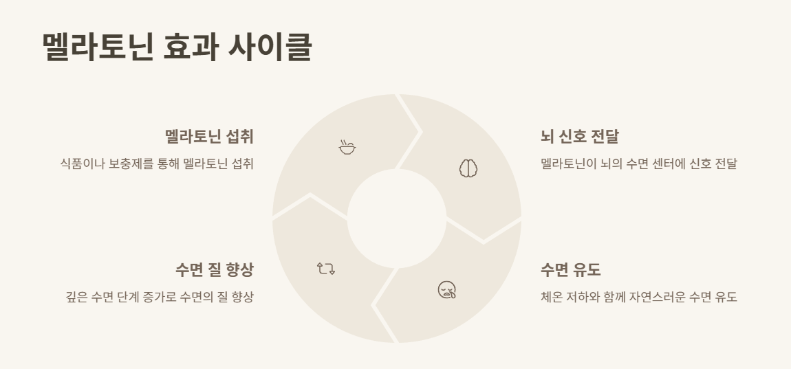 • 뇌 신호 전달 : 멜라토닌이 뇌의 수면 센터에 신호 전달