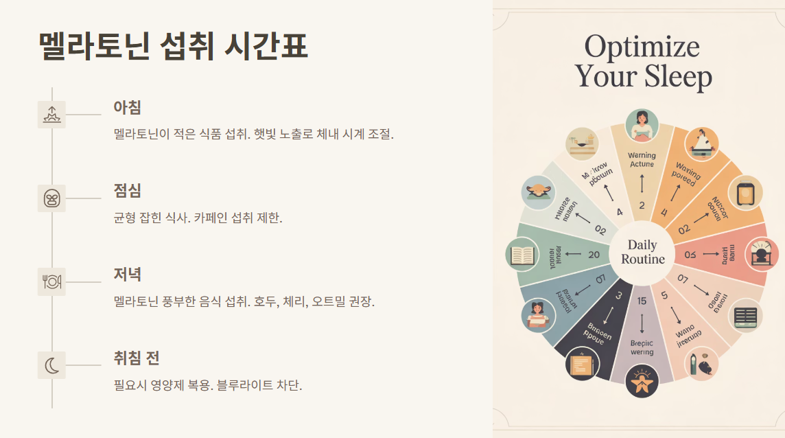 - 아침 : 멜라토닌이 적은 식품 섭취, 햇빛 노출로 체내 시계 조절.