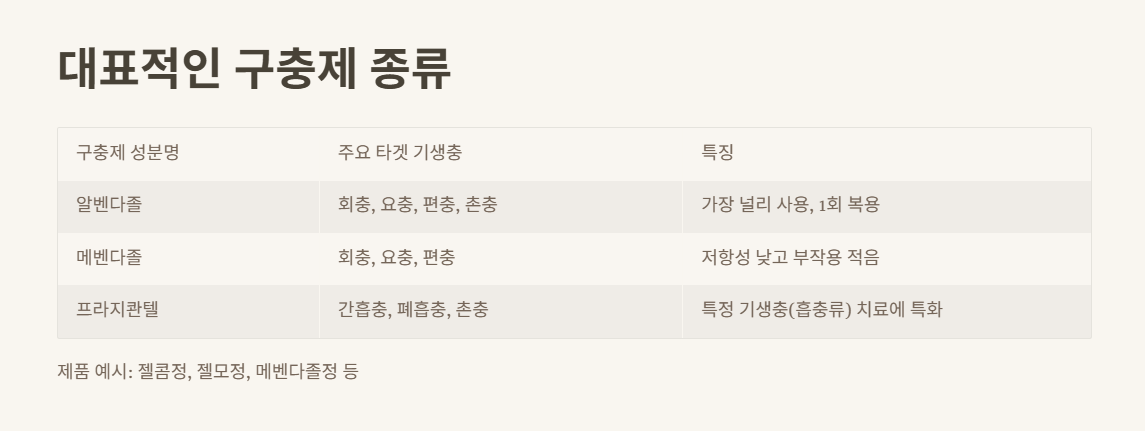 | 구충제 성분명 | 주요 타겟 기생충 | 특징 |