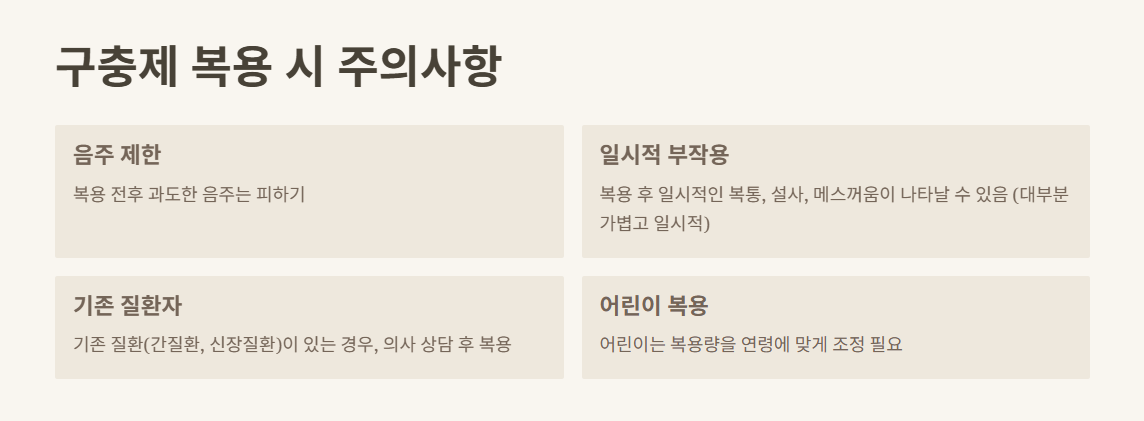 | 알벤다졸 (Albendazole) | 회충, 요충, 편충, 촌충 | 가장 널리 사용, 1회 복용 |
