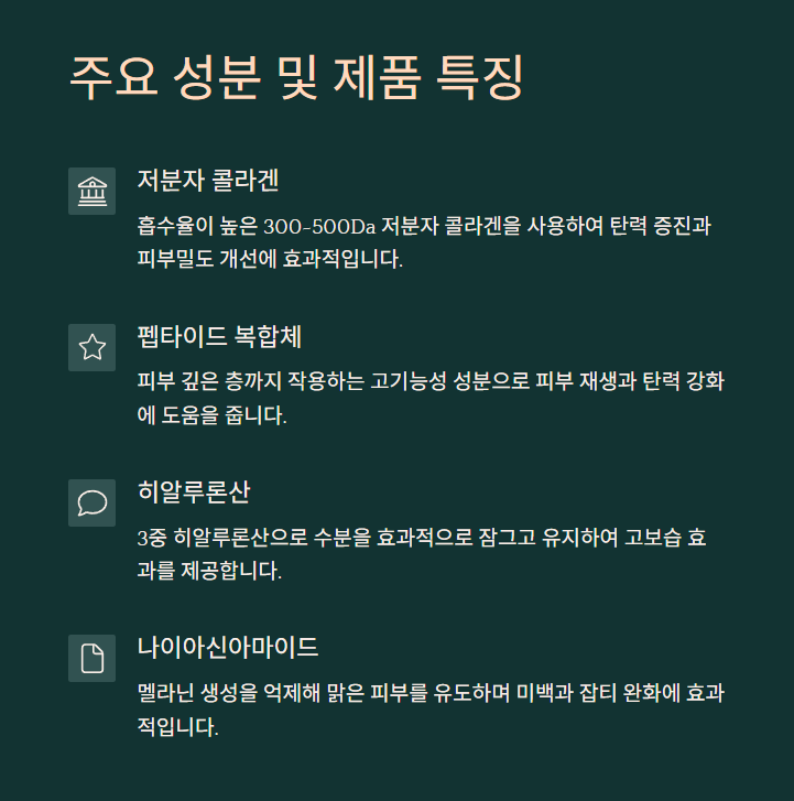 | 저분자 콜라겐 | 탄력 증진 | 흡수율 높은 300~500Da 사용 |