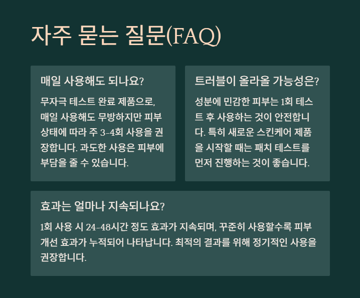 ➤ 1회 사용 시 24~48시간 정도 효과가 지속되고, 꾸준히 사용할수록 피부 개선 효과가 누적되어 나타납니다.