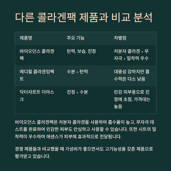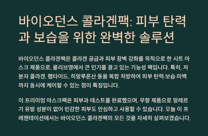 ‘바이오던스 콜라겐팩’은 콜라겐 공급과 피부 장벽 강화를 목적으로 한 시트 마스크 제품입니다. 저분자 콜라겐, 펩타이드, 히알루론산 복합 처방으로 탄력·보습·미백을 한 번에 케어합니다.