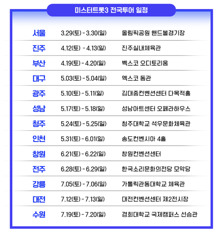 2025년 미스터트롯3 전국투어는 3월부터 7월까지 총 13개 도시에서 열릴 예정입니다. (※ 일부 일정은 변동 가능)