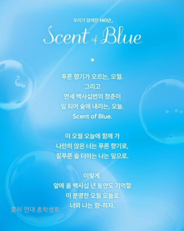 “푸른 향기가 오르는 오월, 연세 백사십년의 청춘이 잎 되어 숲에 내리는 오늘.”