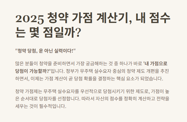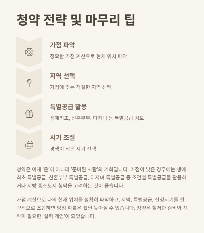 👉 가점은 높을수록 좋지만, 지역·단지에 따라 당첨 커트라인이 다르기 때문에 전략적 접근이 중요합니다.