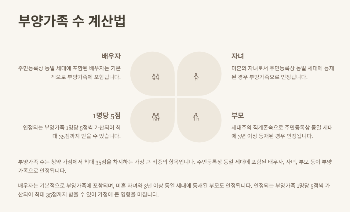 | 부양가족 수 | 기본 배우자 포함, 1명당 5점 | 35점 |