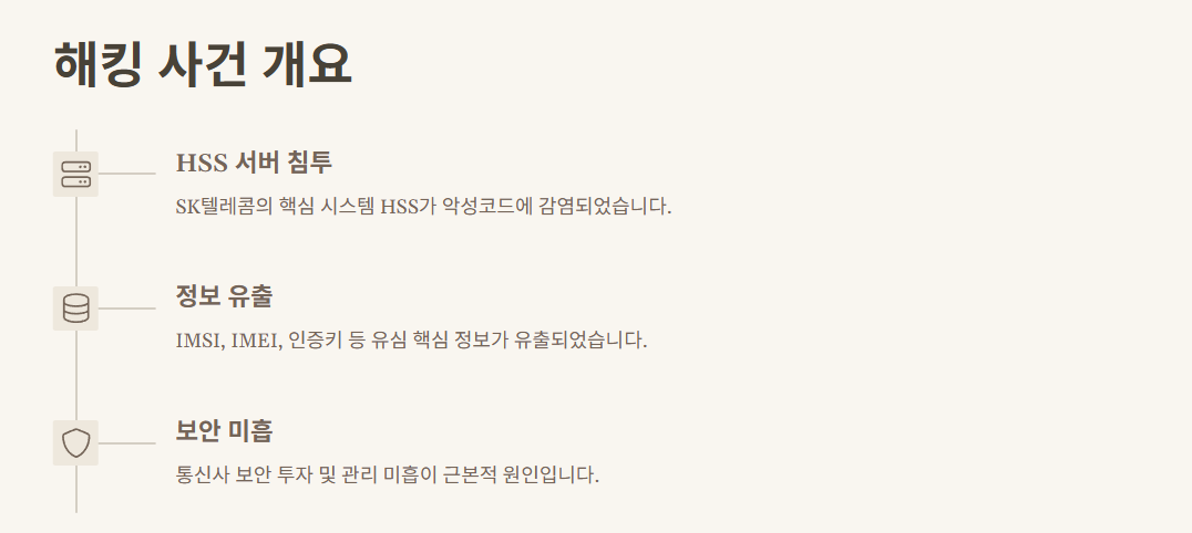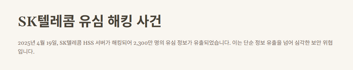 2025년 4월 19일 밤, SK텔레콤의 핵심 시스템 HSS(Home Subscriber Server)가 악성코드에 감염되어 2,300만 명의 유심(USIM) 관련 정보가 유출되는 해킹 사고가 발생했습니다.