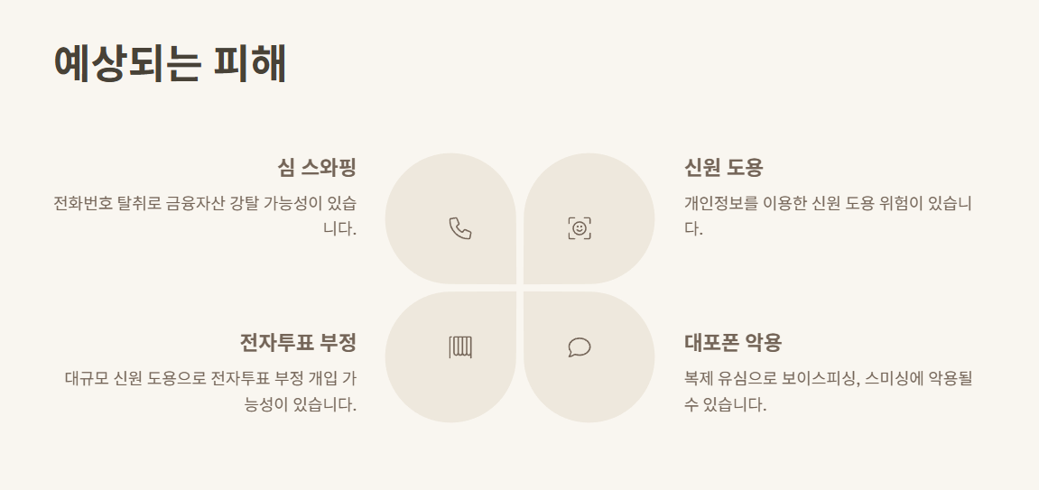 이번 해킹은 단순한 개인정보 유출을 넘어, 심 스와핑(SIM Swapping), 신원 도용, 대포폰 범죄, 심지어 전자투표 시스템 악용 가능성까지 우려되고 있습니다.