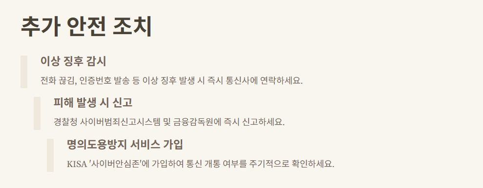 - 이상 징후 감시 : 전화 끊김, 인증번호 발송 등 이상 징후 발생 시 즉시 통신사에 연락하세요.